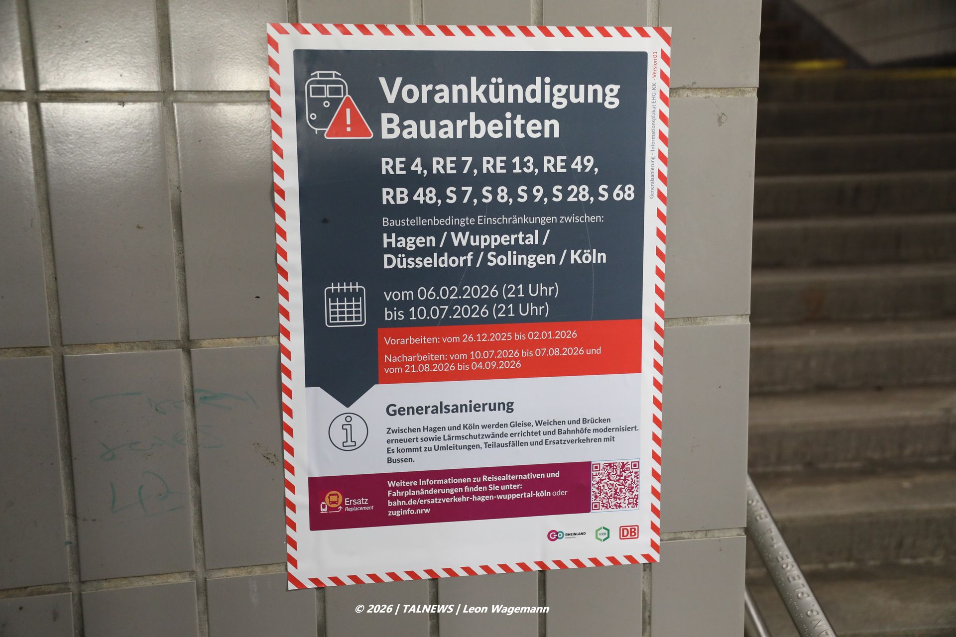Seit dem 6. Februar 2026 um 21 Uhr herrscht entlang der Bahnstrecken zwischen Hagen, Wuppertal, Düsseldorf, Solingen und Köln Ausnahmezustand: Die Deutsche Bahn hat mit einer großangelegten Generalsanierung begonnen, die voraussichtlich bis zum 10. Juli 2026 um 21 Uhr andauern soll. Das Bauprojekt betrifft zentrale Verkehrskorridore des NRW-Schienenverkehrs und sorgt bei Pendlern und Reisenden für massive Einschränkungen. Zahlreiche Linien, darunter die S8, S9 und RB48, sind von Sperrungen betroffen, Schienenersatzverkehre sollen die Lücken füllen. Doch besonders in Wuppertal und Umgebung zeigt sich: Die Umsetzung der Ersatzverbindungen funktioniert vielerorts nur unzureichend. Am Bahnhof Wuppertal-Oberbarmen sind die Hinweise zu den SEV-Haltestellen schlecht erkennbar, teilweise kaum vorhanden oder so klein, dass sie in den Abend- und frühen Morgenstunden praktisch unsichtbar bleiben. Reisende berichten von erheblichen Orientierungsproblemen, insbesondere wenn keine Mitarbeiterinnen oder Mitarbeiter vor Ort sind – und genau das war an mehreren Kontrolltagen der Fall. Die von der Deutschen Bahn beauftragten Fremdfirmen scheinen punktuell Personal einzusetzen, in Oberbarmen jedoch zeitweise gar nicht.