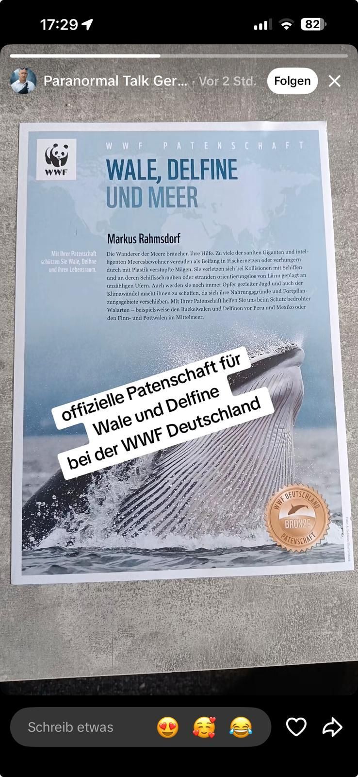 Darüber hinaus postete Rahmsdorf kürzlich ein Dokument, das als offizielles Schreiben von WWF Deutschland (zu Themen WALE, DEFLINE und MEER) dargestellt wurde und den aktuellen Stand zum Buckelwal-Fall wiedergab. Am 19.04.2026 wurden alle derartigen Beiträge entfernt.